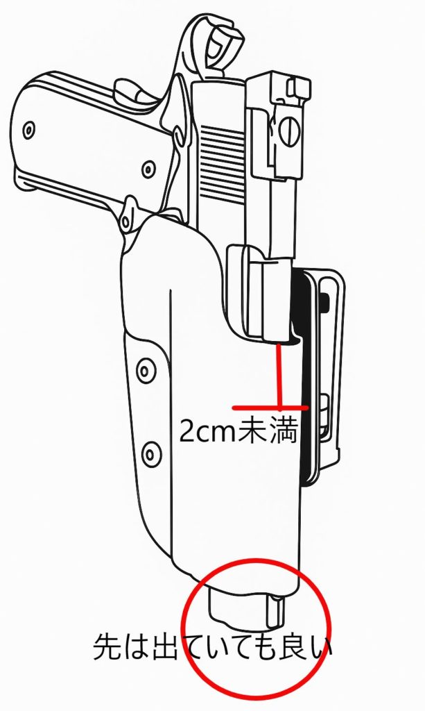 フルカバーホルスター基準:前面のフロントカットは、エジェクションポートより下2cm未満、先は出ていても良い