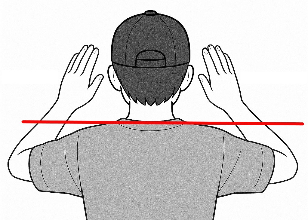 両手(もしくは片手)の手首より上を、肩のラインより上に上げて、ウエストラインにある銃を取ってから撃つ