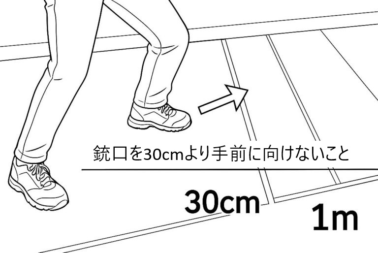 マズル(銃口)は、足元30cm以上、1mの範囲の安全な方向へ向ける