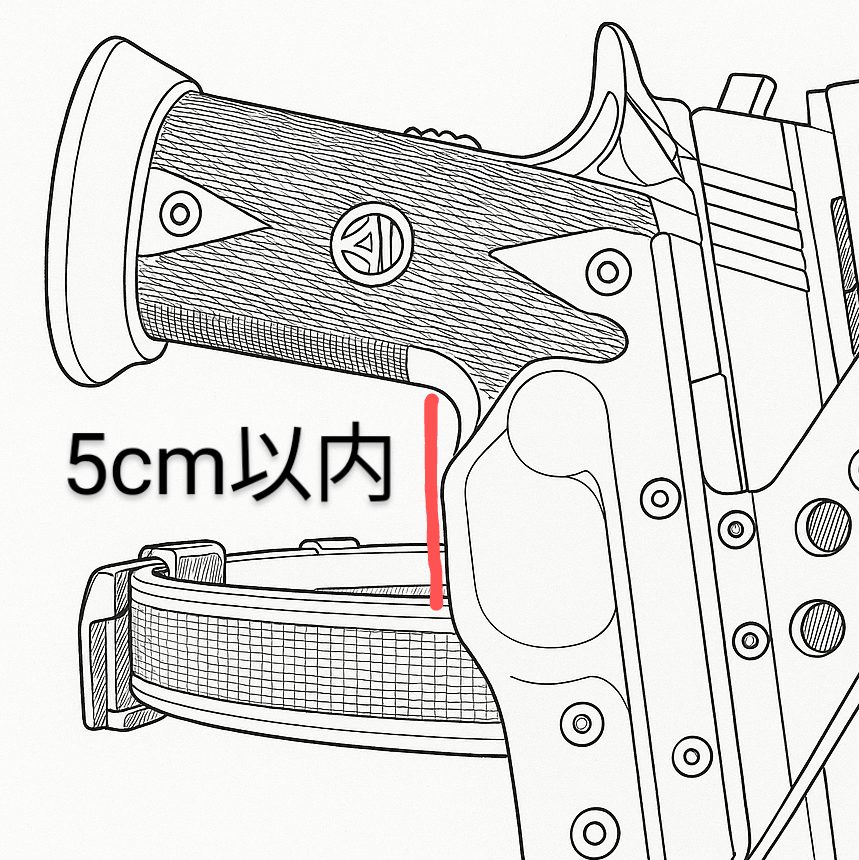 ガンのグリップ後端(マグウェル部品を除く)は、ベルトの上端より上にあるこ/と。