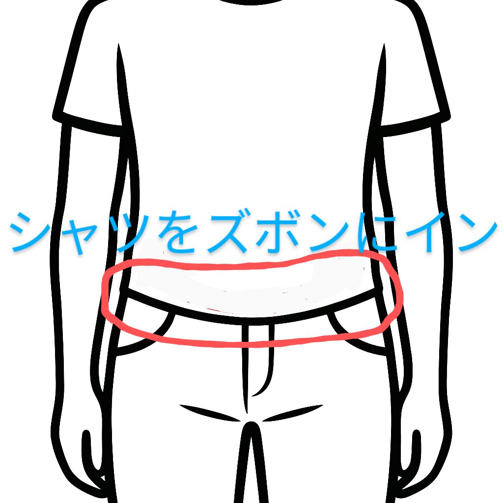 衣服の上からベルトを装着する。ベルトがない場合は、シャツをズボンに入れ、ズボンのウエスト部分をウエストラインに合わせる。